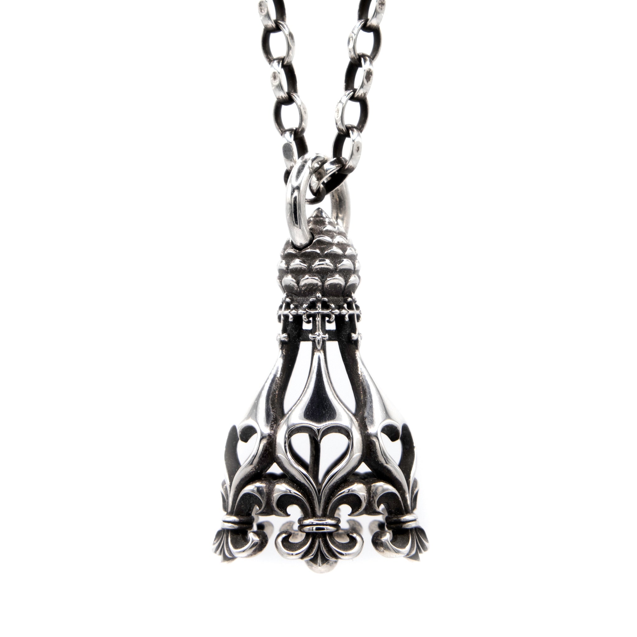 The Silver Hart Bell features a fleur de lis base, a pine cone top adorned with crosses, with hearts resonating in the center.