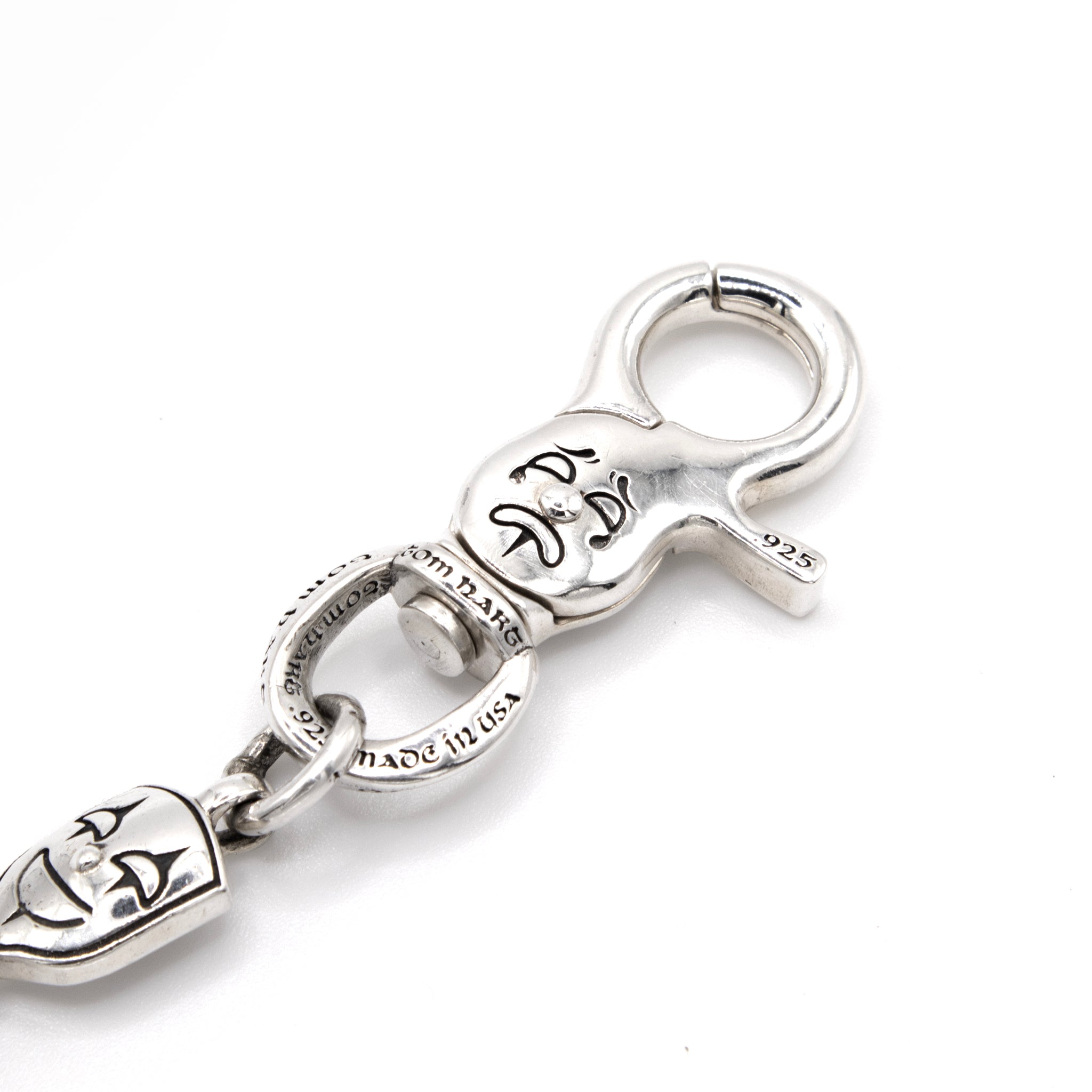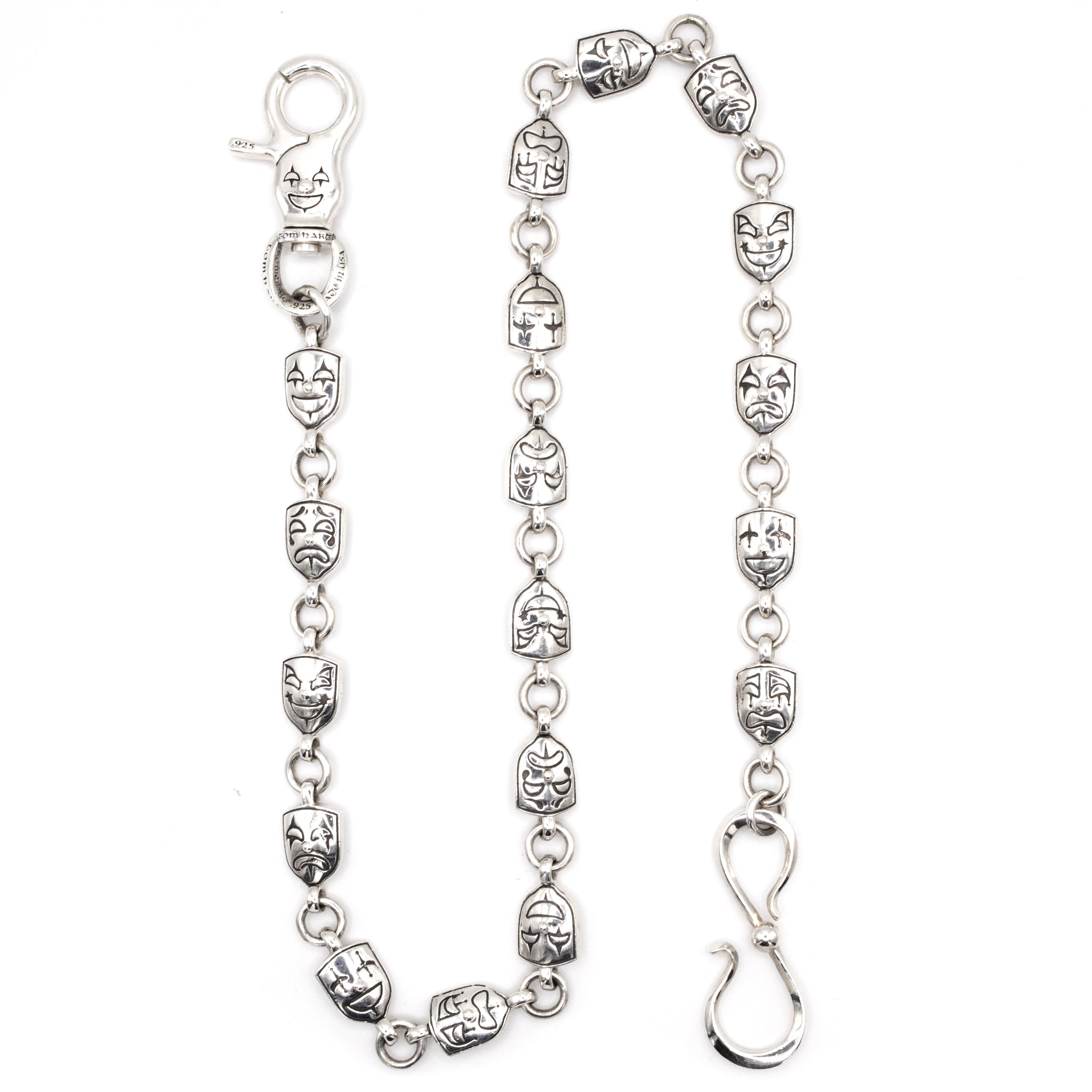 The Emotions wallet chain features 6 different faces expressing different emotions. The lock swivels at the base and the hook can attach to most wallets with an eyelet.